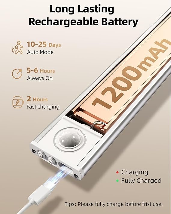 With a built-in rechargeable battery and USB charging cable, you can forget about replacing batteries. The magnetic strip and adhesive backing make installation simple and tool-free — ideal for use under kitchen cabinets, inside closets, stairways, hallways, bathrooms, or even as bedside lights.