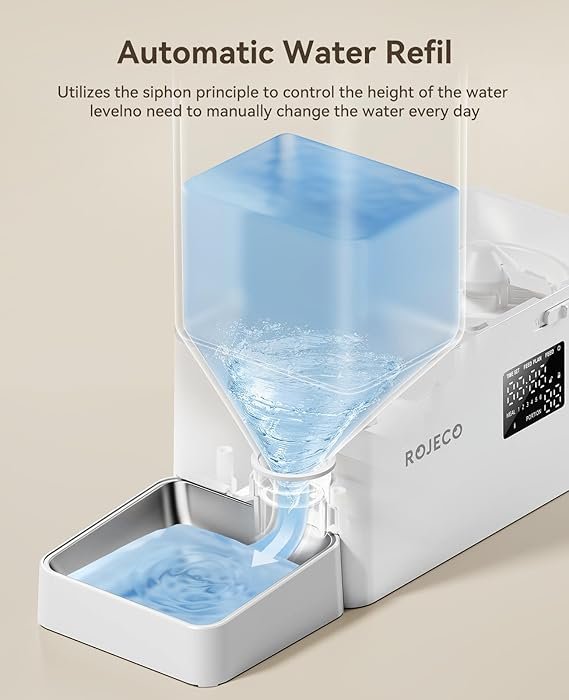 The Rojeco 2-in-1 Automatic Pet Feeder & Water Dispenser (8.5 L / 36 cups) combines a 5 L dry food feeder and 3.5 L gravity water bowl to keep your pet fed and hydrated for days. With programmable meals (1–6 per day, 5–10 g portions), transparent barrels for level monitoring, and dual power (Type-C + AAA battery backup), it’s smart, reliable, and ideal for busy pet owners.