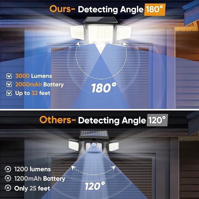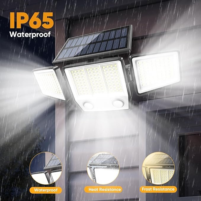 Illuminate your outdoor space with this high-output solar flood light featuring 3,000 lumens of brightness, dual PIR motion sensors with 180° detection, and a 270° wide-angle illumination design—perfect for driveways, patios and yards. Its IP65 weather-resistant build and rechargeable battery ensure reliable performance year-round, while three customizable lighting modes adapt to your security or ambiance needs. Upgrade your outdoor lighting today and enjoy enhanced visibility and peace of mind every night.
