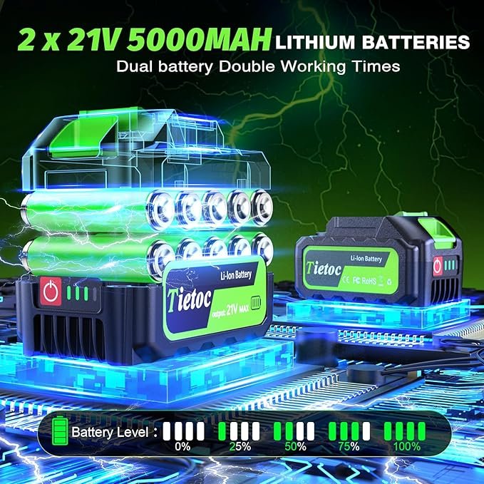 - Battery Capacity: 21V 5.0Ah (Dual batteries)