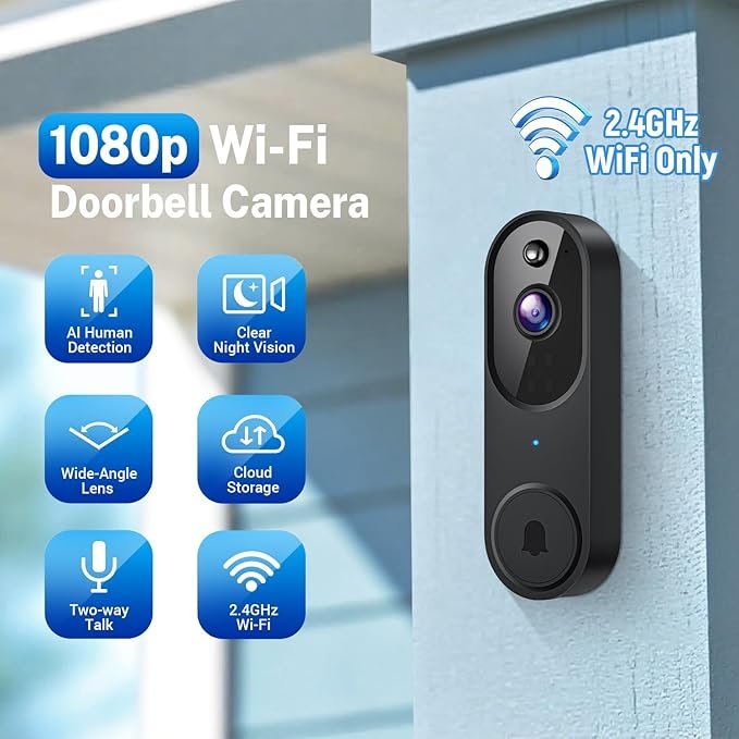 Enhance your home security with this advanced wireless video doorbell. Equipped with AI-powered motion detection, it delivers instant alerts to your smartphone, ensuring you’re always informed. The two-way audio feature allows real-time communication, while night vision ensures clarity around the clock. With cloud storage support and easy installation via 2.4GHz Wi-Fi, it’s a reliable choice for modern homes